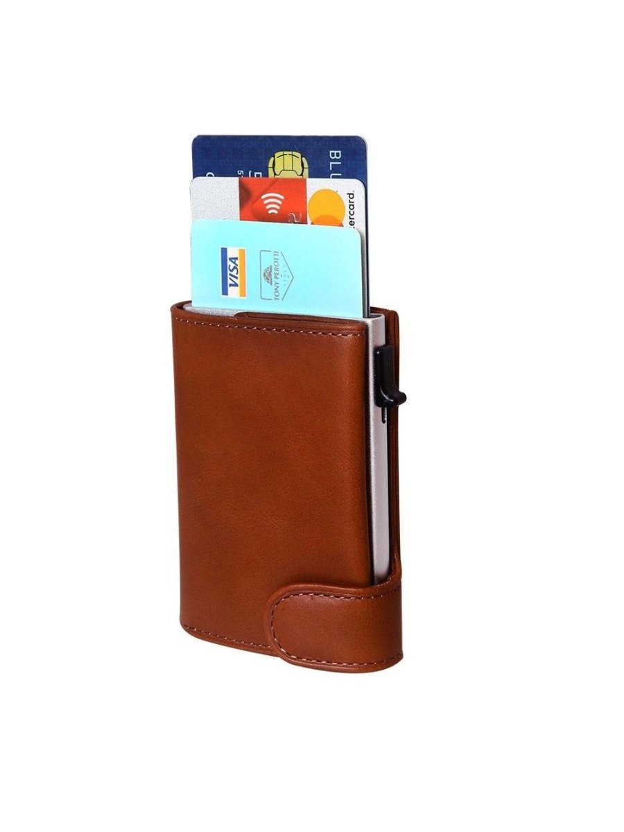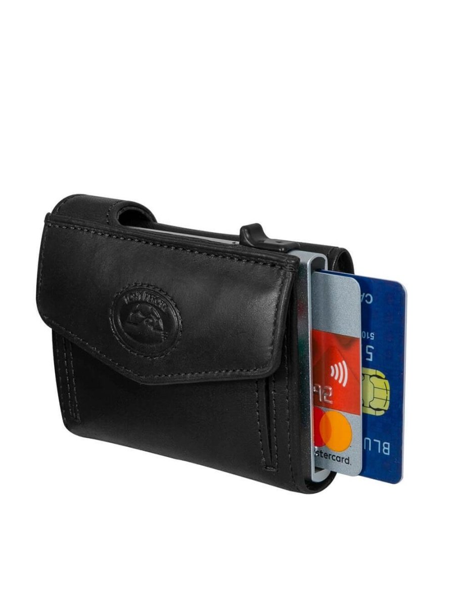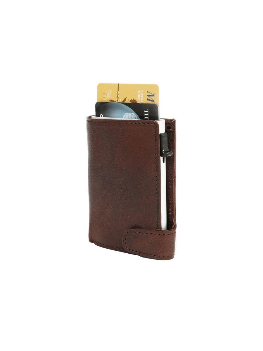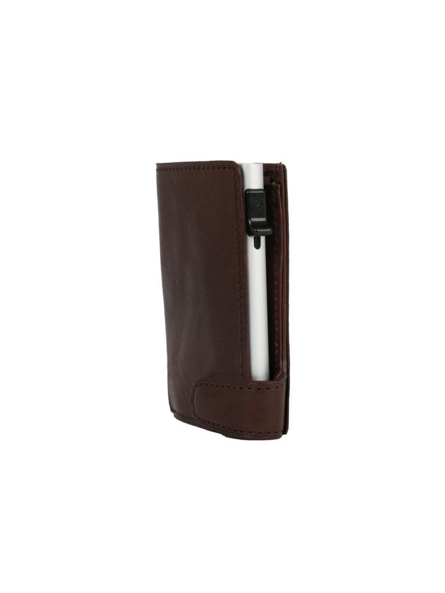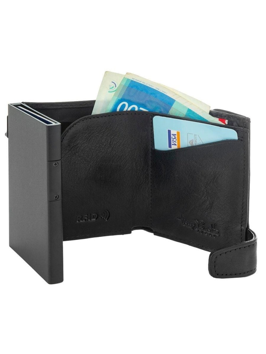 נרתיק קטן וקשיח עשוי עור איטלקי לגבר בעל הגנת RFID נגד גניבת מידע שעל הכרטיס. הנרתיק בעל 4 תאים לכרטיסים (תא אחד עם הגנת RFID), כיס קטן למזומן וכיס למטבעות.