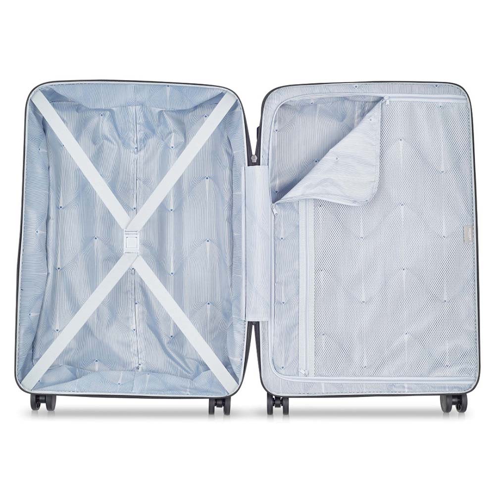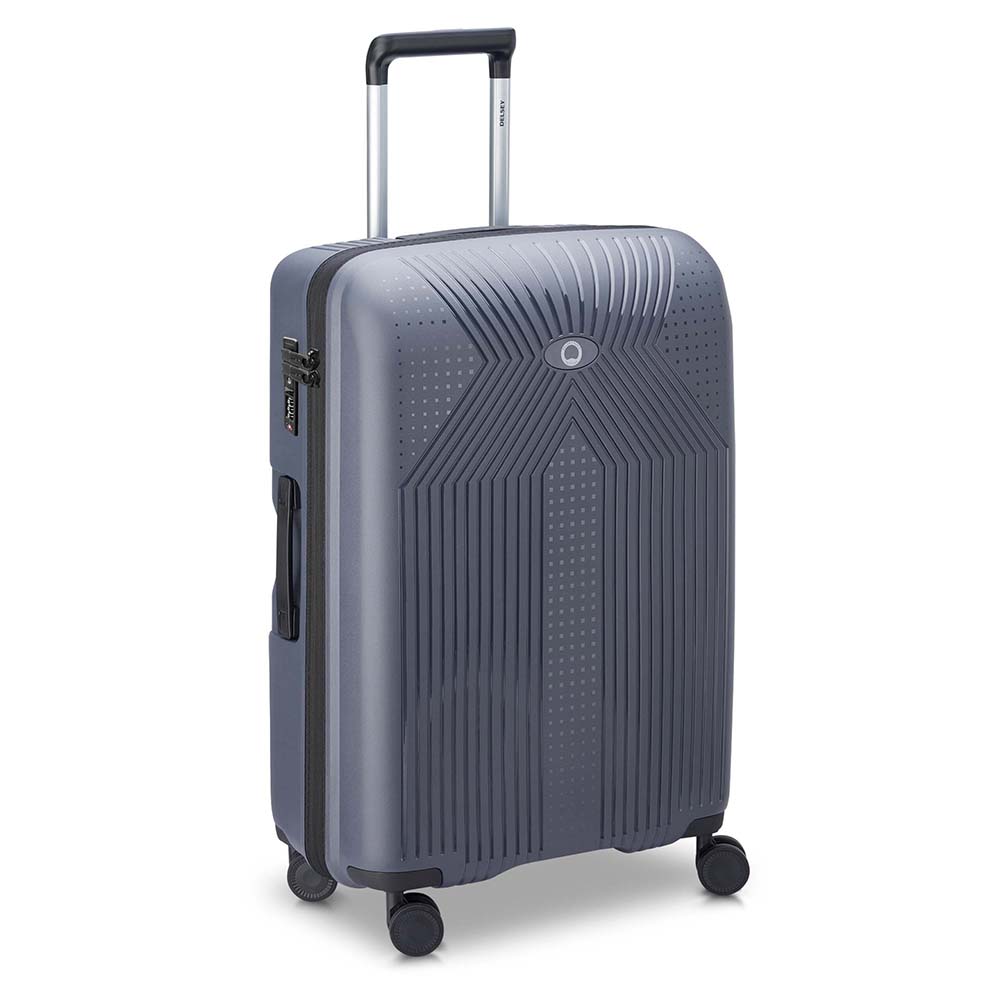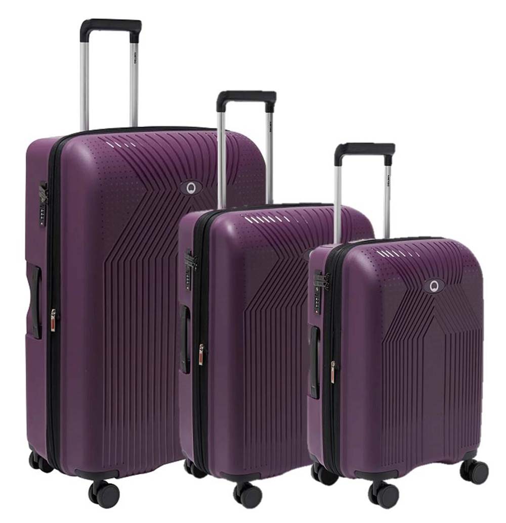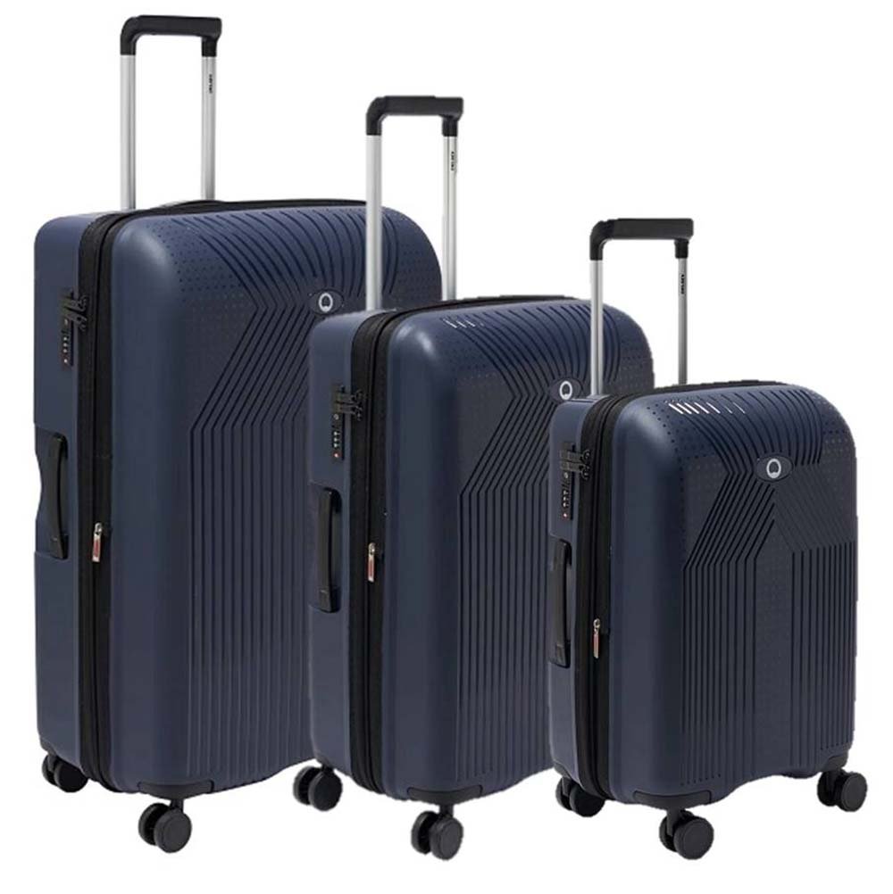 סט שלישיית מזוודות קשיחות במשקל קל במיוחד של חברת Delsey הצרפתית, עשויות 100% פוליפרופילן חזק ומאסיבי, 4 גלגלי סיליקון כפולים לנסיעה חלקה ואיכותית
