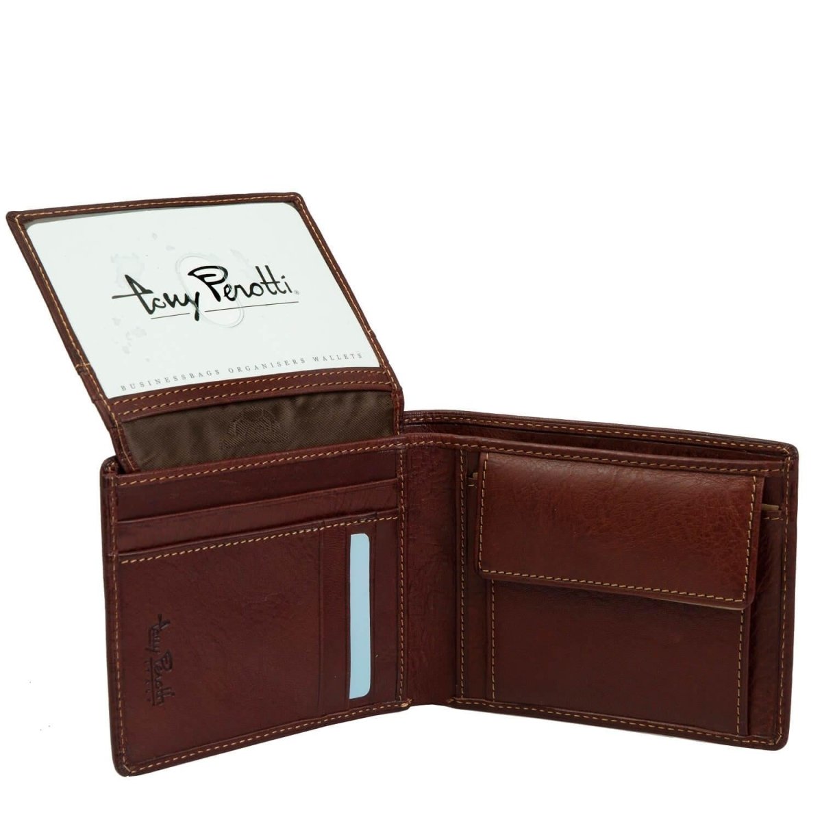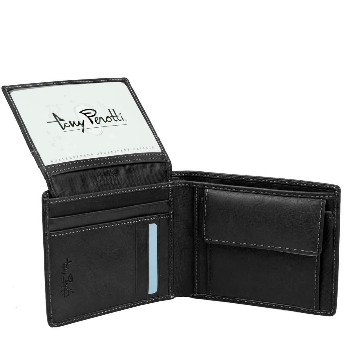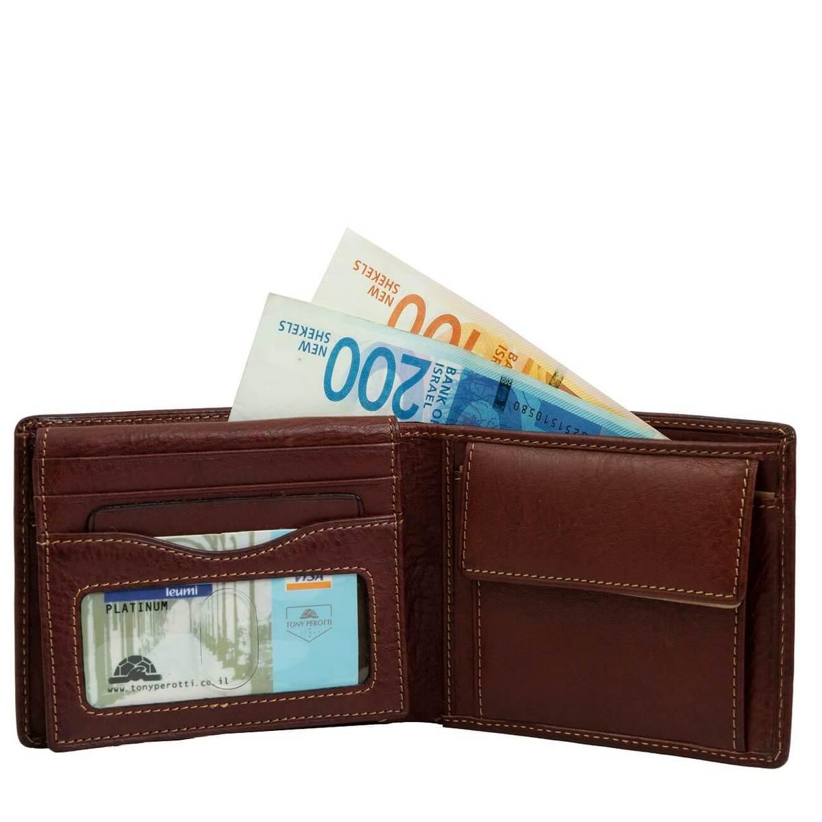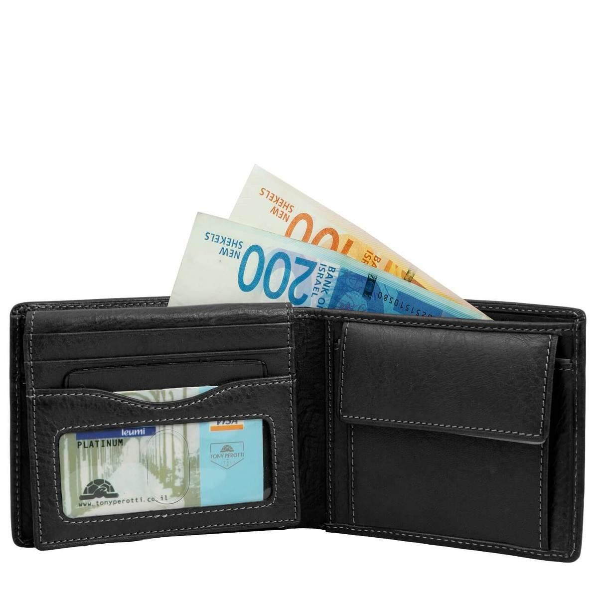 ארנק לגבר עשוי עור איטלקי, מכיל 10 תאים לכרטיסים שונים, תא שקוף להצגת רישיונות, תא למטבעות ושני כיסים למזומן – עם כיס נסתר המאפשר להחזקה בטוחה של שטרות. אחראיות לשנה לארנקי טוני פרוטי