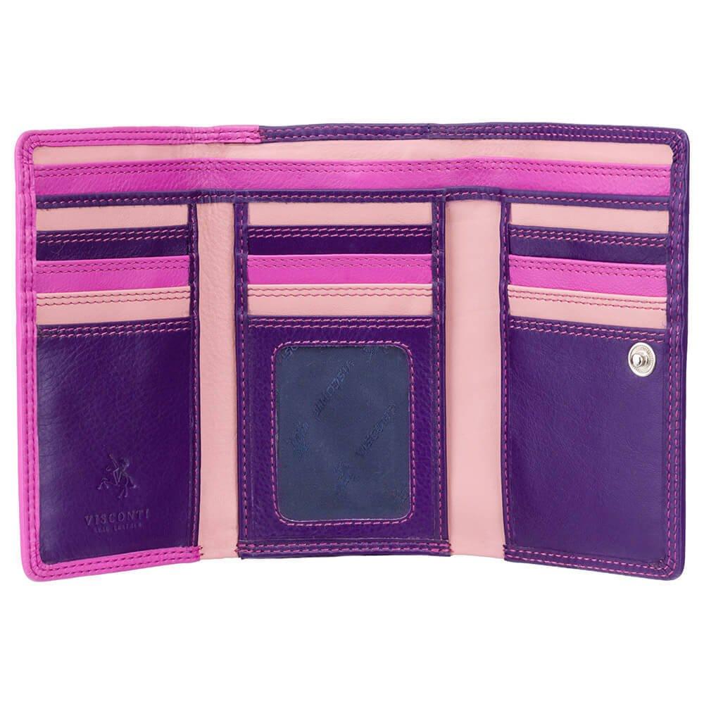 סדרת ארנקי Rainbow משלבת קשת צבעים באיכות בלתי מתפשרת עם התפר הכפול אשר מבטיח שהארנק יישמר למשך שנים ולא יאבד מאיכותו. הארנק אשר נוצר באמצעות עור רך מכיל 11 תאים פנימיים לכרטיסים, תא שקוף לתעודה מזהה, 2 תאים לשטרות וקבלות. חלקו האחורי של הארנק מכיל 2 תאים עם רוכסן למטבעות המאפשרים ארגון נוח וסדר. הגנת RFID מפני סריקת פרטי כרטיס אשראי. למוצרי Visconti אחריות לשנה של היצרן